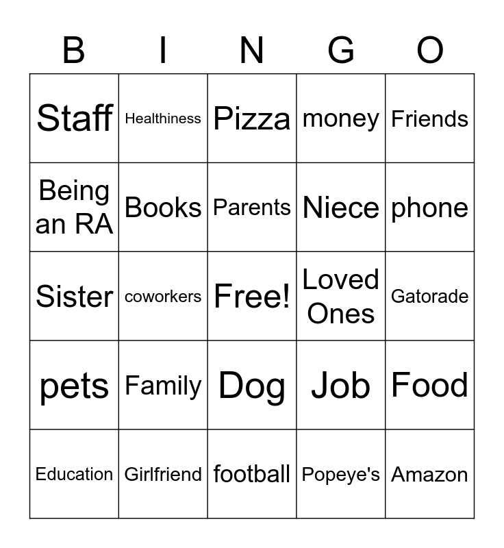 This bingo card has a free space and 24 words: Family, Girlfriend, Parents, Education, Friends, Staff, Being an RA, Healthiness, Loved Ones, Dog, Niece, Sister, Job, Food, Books, Popeye's, Gatorade, Pizza, phone, coworkers, Amazon, pets, money and football.