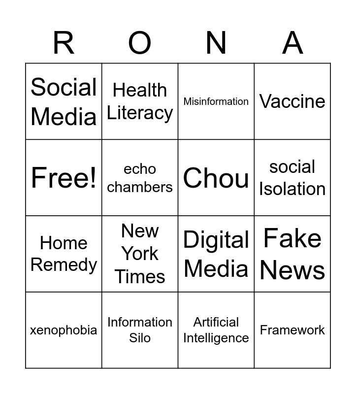 This bingo card has 16 words: Information Silo, Fake News, Misinformation, Social Media, Home Remedy, Health Literacy, Digital Media, Artificial Intelligence, Free!, echo chambers, xenophobia, Vaccine, New York Times, social Isolation, Chou and Framework.
