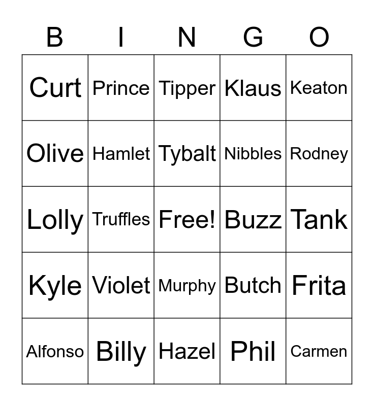 This bingo card has a free space and 391 words: Admiral, Agent S, Agnes, Al, Alfonso, Alice, Alli, Amelia, Anabelle, Anchovy, Angus, Anicotti, Ankha, Annalisa, Annalise, Antonio, Apollo, Apple, Astrid, Audie, Aurora, Ava, Avery, Axel, Baabara, Bam, Bangle, Barold, Bea, Beardo, Beau, Becky, Bella, Benedict, Benjamin, Bertha, Bettina, Bianca, Biff, Big Top, Bill, Billy, Biskit, Bitty, Blaire, Blanche, Bluebear, Bob, Bonbon, Bones, Boomer, Boone, Boots, Boris, Boyd, Bree, Broccolo, Broffina, Bruce, Bubbles, Buck, Bud, Bunnie, Butch, Buzz, Cally, Camofrog, Canberra, Candi, Carmen, Caroline, Carrie, Cashmere, Celia, Cesar, Chadder, Charlise, Cheri, Cherry, Chester, Chevre, Chief, Chops, Chow, Chrissy, Claude, Claudia, Clay, Cleo, Clyde, Coach, Cobb, Coco, Cole, Colton, Cookie, Cousteau, Cranston, Croque, Cube, Curlos, Curly, Curt, Cyd, Cyrano, Daisy, Deena, Deirdre, Del, Deli, Derwin, Diana, Diva, Dizzy, Dobie, Doc, Dom, Dora, Dotty, Drago, Drake, Drift, Ed, Egbert, Elise, Ellie, Elmer, Eloise, Elvis, Erik, Eugene, Eunice, Fang, Fauna, Felicity, Filbert, Flip, Flo, Flora, Flurry, Francine, Frank, Freckles, Freya, Friga, Frita, Frobert, Fuchsia, Gabi, Gala, Gaston, Gayle, Genji, Gigi, Gladys, Gloria, Goldie, Gonzo, Goose, Graham, Greta, Grizzly, Groucho, Gruff, Gwen, Hamlet, Hamphrey, Hans, Harry, Hazel, Henry, Hippeux, Hopkins, Hopper, Hornsby, Huck, Hugh, Iggly, Ike, Jacob, Jacques, Jambette, Jay, Jeremiah, Jitters, Joey, Judy, Julia, Julian, June, Kabuki, Katt, Keaton, Ken, Ketchup, Kevin, Kid Cat, Kidd, Kiki, Kitt, Kitty, Klaus, Knox, Kody, Kyle, Leonardo, Leopold, Lily, Limberg, Lionel, Lobo, Lolly, Lopez, Louie, Lucha, Lucky, Lucy, Lyman, Mac, Maddie, Maelle, Maggie, Mallary, Maple, Marcel, Marcie, Margie, Marina, Marshal, Mathilda, Megan, Melba, Merengue, Merry, Midge, Mint, Mira, Miranda, Mitzi, Moe, Molly, Monique, Monty, Moose, Mott, Muffy, Murphy, Nan, Nana, Naomi, Nate, Nibbles, Norma, O'Hare, Octavian, Olaf, Olive, Olivia, Opal, Ozzie, Pancetti, Pango, Paolo, Papi, Pashmina, Pate, Patty, Paula, Peaches, Peanut, Pecan, Peck, Peewee, Peggy, Pekoe, Penelope, Phil, Phoebe, Pierce, Pietro, Pinky, Piper, Pippy, Plucky, Pompom, Poncho, Poppy, Portia, Prince, Puck, Puddles, Pudge, Punchy, Purrl, Queenie, Quillson, Raddle, Rasher, Raymond, Renée, Reneigh, Rex, Rhonda, Ribbot, Ricky, Rizzo, Roald, Robin, Rocco, Rocket, Rod, Rodeo, Rodney, Rolf, Rooney, Rory, Roscoe, Rosie, Rowan, Ruby, Rudy, Sally, Samson, Sandy, Savannah, Scoot, Shari, Sheldon, Shep, Sherb, Simon, Skye, Sly, Snake, Snooty, Soleil, Sparro, Spike, Spork, Sprinkle, Sprocket, Static, Stella, Sterling, Stinky, Stitches, Stu, Sydney, Sylvana, Sylvia, T-Bone, Tabby, Tad, Tammi, Tammy, Tangy, Tank, Tasha, Teddy, Tex, Tia, Tiffany, Timbra, Tipper, Tom, Truffles, Tucker, Tutu, Twiggy, Tybalt, Ursala, Velma, Vesta, Vic, Victoria, Violet, Vivian, Vladimir, Wade, Walker, Walt, Wart Jr., Weber, Wendy, Whitney, Willow, Winnie, Wolfgang, Yuka, Zell and Zucker.