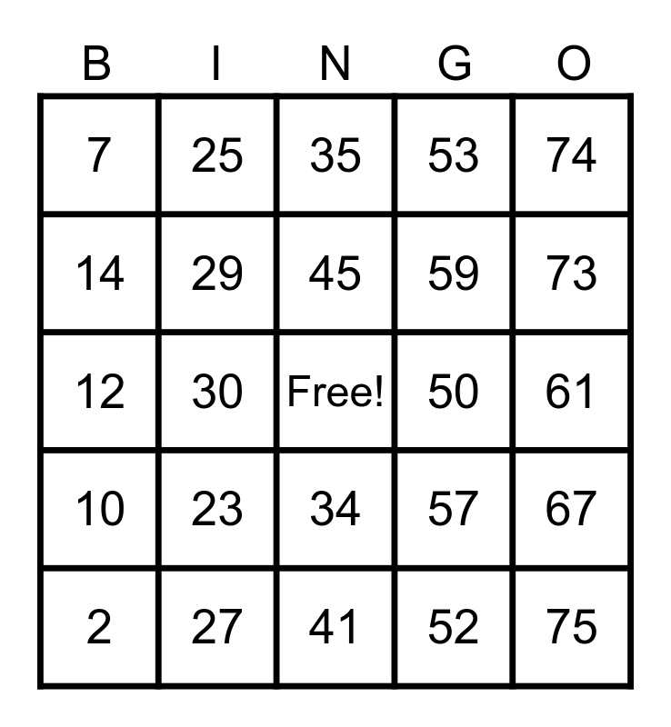 This bingo card has a free space and 24 words: 2, 23, 45, 52, 74, 7, 25, 35, 50, 61, 12, 29, 57, 67, 14, 27, 41, 53, 73, 10, 30, 34, 59 and 75.