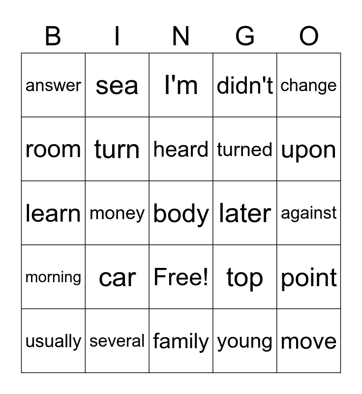 This bingo card has 26 words: Free!, young, heard, several, change, answer, room, sea, against, top, turned, learn, point, usually, money, seen, didn't, morning, I'm, body, upon, family, later, car, turn and move.