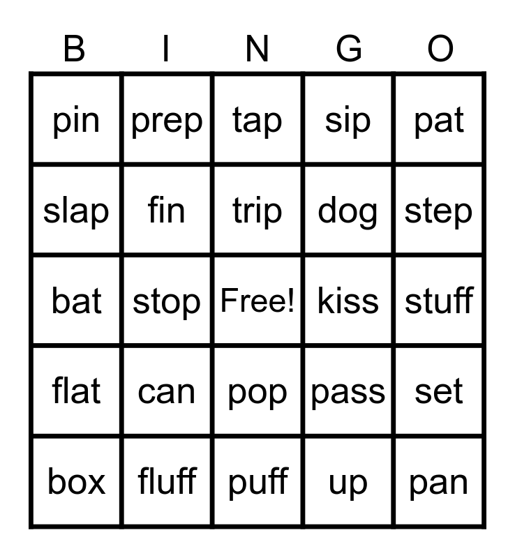 This bingo card has a free space and 24 words: can, fluff, trip, box, pat, pin, slap, prep, kiss, pop, dog, bat, pass, set, fin, up, stuff, tap, step, stop, pan, flat, sip and puff.