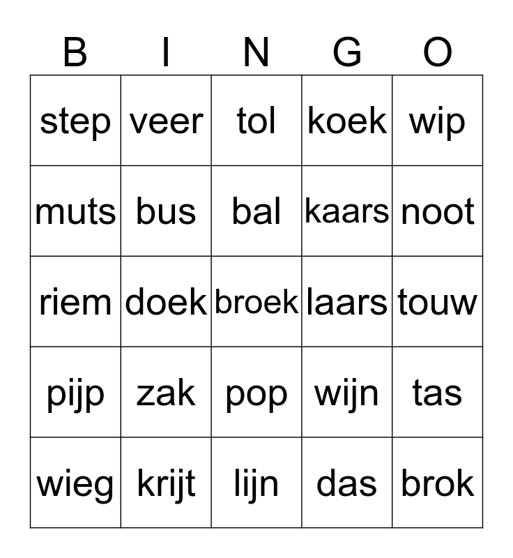 This bingo card has a free space and 24 words: zak, krijt, bal, wieg, wip, step, muts, veer, laars, pop, kaars, riem, wijn, tas, bus, das, touw, tol, noot, doek, brok, pijp, koek and lijn.