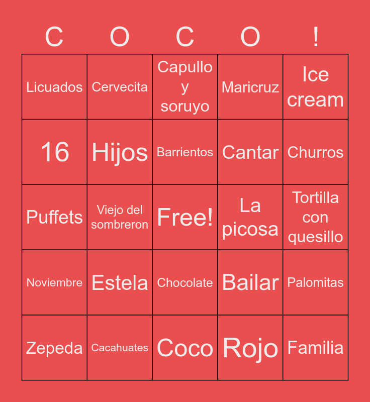 This bingo card has a free space and 26 words: Mami, Estela, Coco, Rojo, Churros, Licuados, Cervecita, Capullo y soruyo, Cantar, Palomitas, Puffets, Viejo del sombreron, Bailar, Familia, Noviembre, Cacahuates, Barrientos, La picosa, Ice cream, Zepeda, Hijos, Chocolate, Maricruz, Tortilla con quesillo, 16 and Dennys.