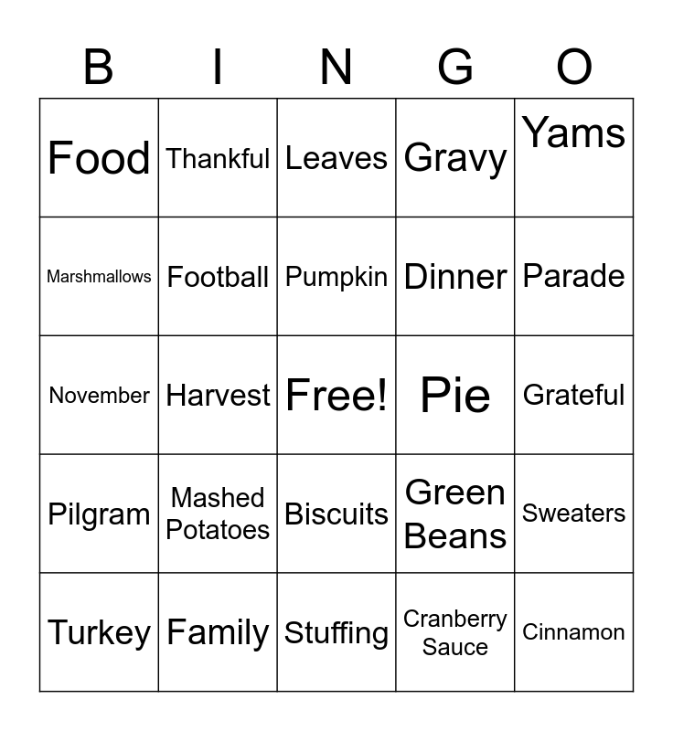 This bingo card has a free space and 29 words: Turkey, Thanksgiving, Harvest, Fall, Food, Leaves, Football, Mashed Potatoes, Pie, Family, Grateful, Cinnamon, Stuffing, Cranberry Sauce, Parade, Corn, Biscuits, Pilgram, Yams, November, Green Beans, Apple Cider, Dinner, Marshmallows, Gravy, Thankful, Sweaters, Pumpkin and Hot Chocolate.