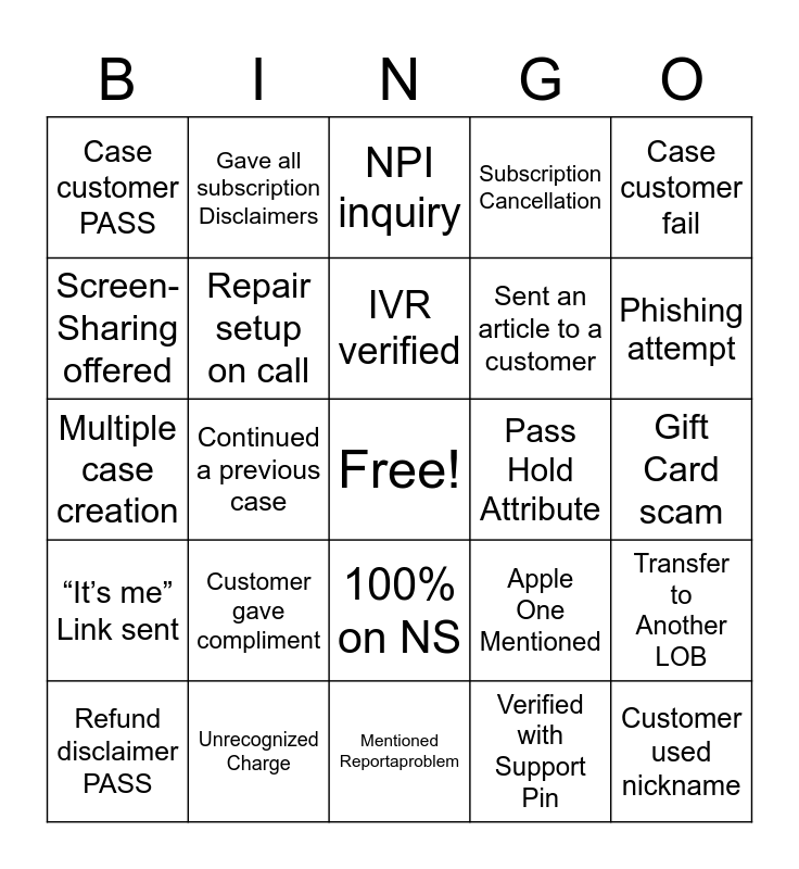 This bingo card has a free space and 24 words: Refund disclaimer PASS, Customer gave compliment, IVR verified, Verified with Support Pin, Case customer fail, Case customer PASS, Gave all subscription Disclaimers, NPI inquiry, Pass Hold Attribute, Gift Card scam, Multiple case creation, Repair setup on call, Apple One Mentioned, Transfer to Another LOB, Screen-Sharing offered, Unrecognized Charge, Mentioned Reportaproblem, Subscription Cancellation, Phishing attempt, “It’s me” Link sent, Continued a previous case, 100% on NS, Sent an article to a customer and Customer used nickname.