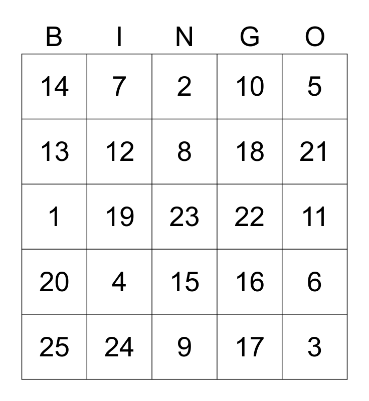 This bingo card has a free space and 24 words: 4, 24, 8, 25, 5, 14, 13, 7, 22, 15, 18, 1, 16, 6, 12, 17, 11, 2, 21, 19, 3, 20, 10 and 9.