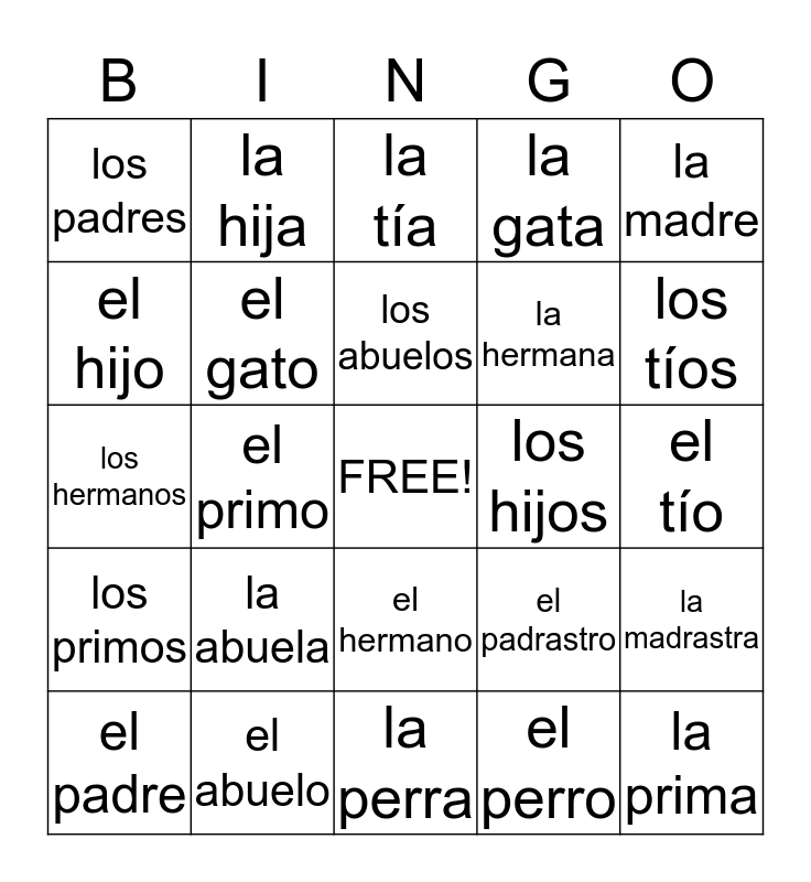 This bingo card has a free space and 24 words: la abuela, el abuelo, los abuelos, el padre, la madre, los padres, el hijo, la hija, los hijos, el hermano, la hermana, los hermanos, el padrastro, la madrastra, el gato, el perro, el tío, la tía, los tíos, el primo, la prima, los primos, la gata and la perra.