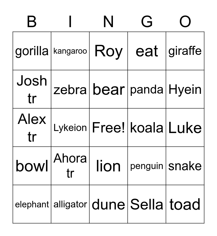This bingo card has a free space and 24 words: Ahora tr, alligator, bear, elephant, giraffe, gorilla, Josh tr, kangaroo, koala, lion, panda, Alex tr, penguin, snake, zebra, Sella, Luke, Roy, Hyein, Lykeion, toad, bowl, eat and dune.