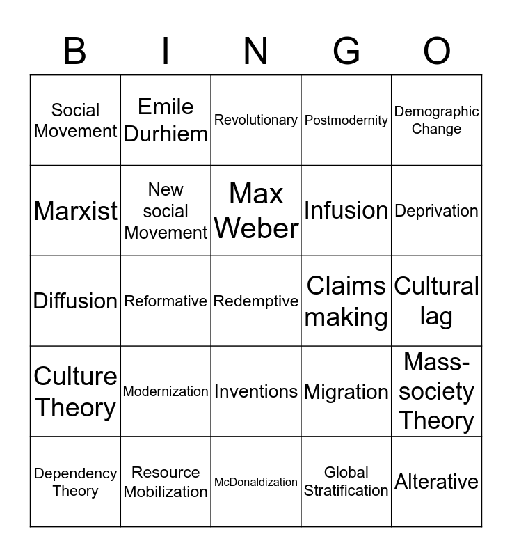 This bingo card has 25 words: Modernization, McDonaldization, Max Weber, Dependency Theory, Demographic Change, Social Movement, Marxist, Emile Durhiem, Claims making, Inventions, Infusion, Diffusion, Migration, Mass-society Theory, New social Movement, Alterative, Cultural lag, Revolutionary, Deprivation, Reformative, Redemptive, Resource Mobilization, Culture Theory, Postmodernity and Global Stratification.