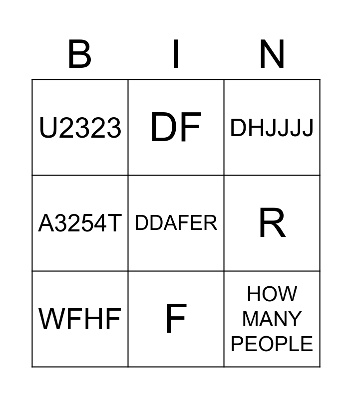 This bingo card has a free space and 17 words: SDFSDFSDF, YGFGH, DHJJJJ, U2323, MMJJJ, A3254T, SFAQ3Q, WFHF, F, R, Q, D, HOW MANY PEOPLE, DF, D, F and G.