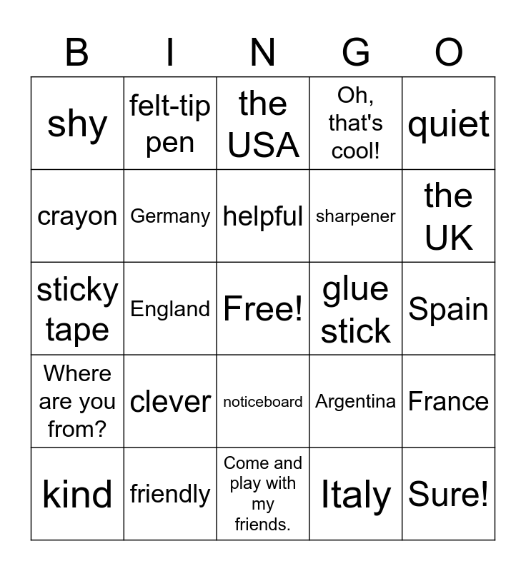 This bingo card has a free space and 24 words: clever, friendly, helpful, kind, quiet, shy, crayon, felt-tip pen, glue stick, noticeboard, sharpener, sticky tape, Argentina, France, Germany, Italy, Spain, the USA, the UK, England, Sure!, Where are you from?, Oh, that's cool! and Come and play with my friends..