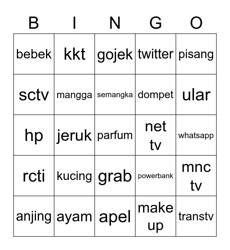 This bingo card has a free space and 24 words: kucing, ayam, semangka, anjing, pisang, bebek, sctv, kkt, net tv, grab, dompet, hp, powerbank, mnc tv, mangga, make up, whatsapp, gojek, ular, jeruk, transtv, rcti, twitter and apel.