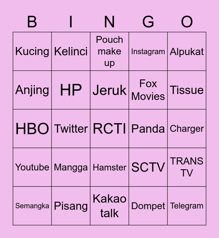 This bingo card has a free space and 24 words: Mangga, Pisang, Jeruk, Semangka, Alpukat, Kucing, Anjing, Kelinci, Panda, Hamster, Fox Movies, HBO, SCTV, TRANS TV, HP, Dompet, Charger, Pouch make up, Tissue, Twitter, Telegram, Youtube, Instagram and Kakao talk.