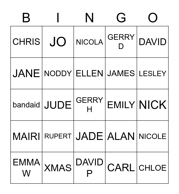 This bingo card has 40 words: All I want for christmas, bandaid, BLA, NODDY, XMAS, JADE, ELLEN, ROSS, DAVID, MAIRI, JUDE, GERRY D, GERRY H, NICK, EMILY, RUPERT, EWAN, CHRIS, EMMA, NICOLA, NICOLE, CARL, JAMES, JANE, TOM, SEAN, NEAL, CAITLIN, CHLOE, JAN, JUSTIN, EMMA W, ANDY, ALAN, LESLEY, DAVID P, LIZZIE, CAT, JO and JONITA.