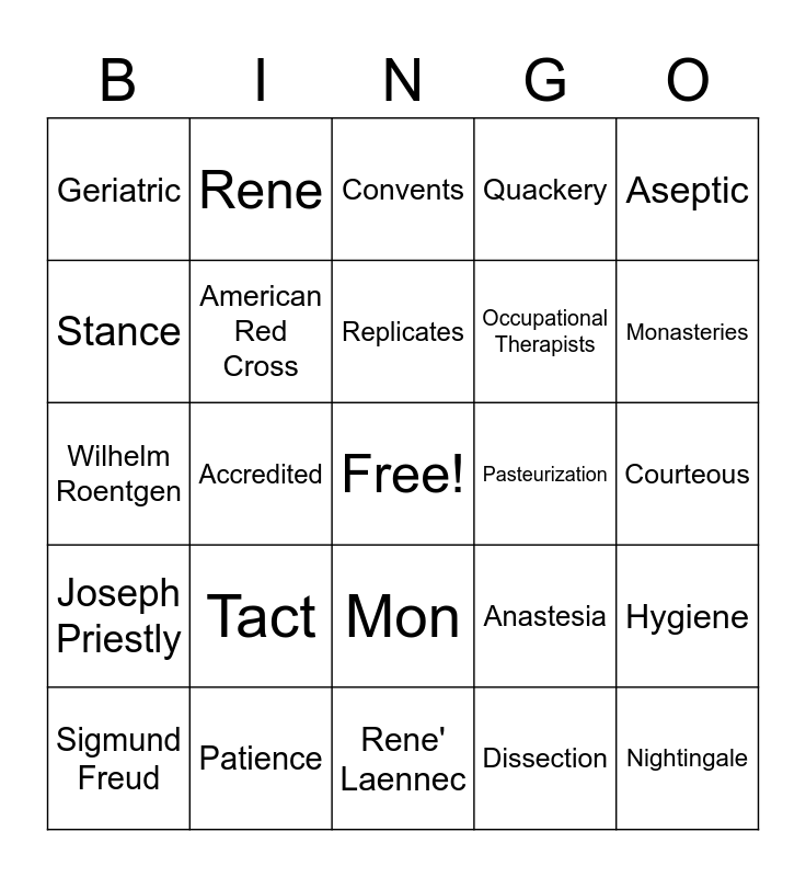 This bingo card has a free space and 24 words: Sigmund Freud, Tact, Replicates, Dissection, Aseptic, Geriatric, Rene, Convents, Pasteurization, Courteous, Wilhelm Roentgen, American Red Cross, Anastesia, Hygiene, Stance, Patience, Rene' Laennec, Quackery, Monasteries, Joseph Priestly, Accredited, Mon, Occupational Therapists and Nightingale.