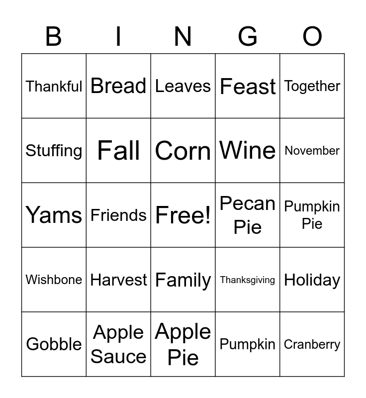 This bingo card has a free space and 24 words: Harvest, Apple Sauce, Corn, Gobble, Together, Thankful, Stuffing, Bread, Pecan Pie, Family, Wine, Yams, Thanksgiving, Holiday, Fall, Pumpkin, Pumpkin Pie, Leaves, November, Friends, Cranberry, Wishbone, Feast and Apple Pie.