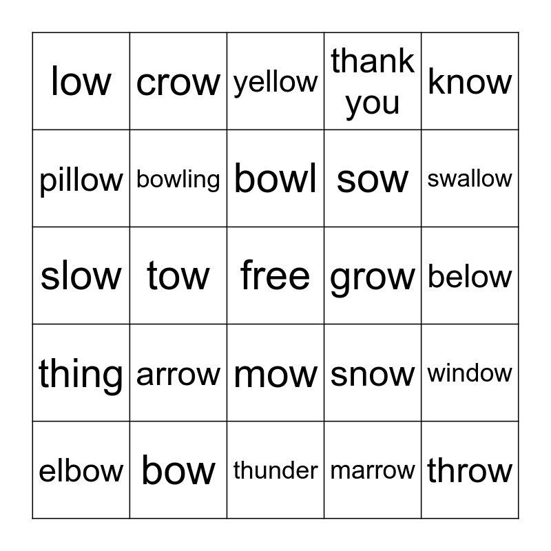 This bingo card has a free space and 24 words: arrow, bow, bowl, elbow, know, low, pillow, crow, grow, mow, sow, slow, snow, window, bowling, marrow, below, yellow, swallow, tow, throw, thing, thank you and thunder.