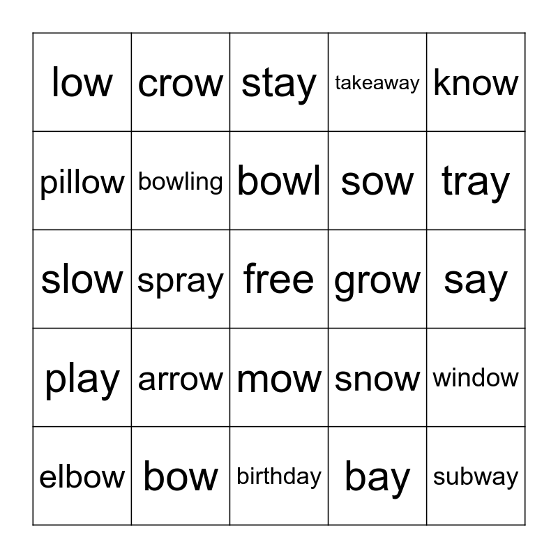This bingo card has a free space and 24 words: arrow, bow, bowl, elbow, know, low, pillow, crow, grow, mow, sow, slow, snow, window, bowling, bay, say, stay, tray, spray, subway, play, takeaway and birthday.