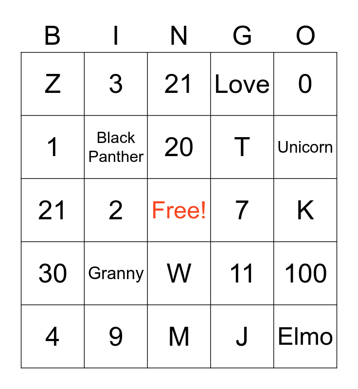 This bingo card has a free space and 29 words: 4, D, 2, Lego, Z, 21, Black Panther, Granny, 7, 9, K, Elmo, M, J, Unicorn, 8, W, 30, 0, 21, 11, Spider Man, T, 1, Love, 3, 100, 20 and Family.