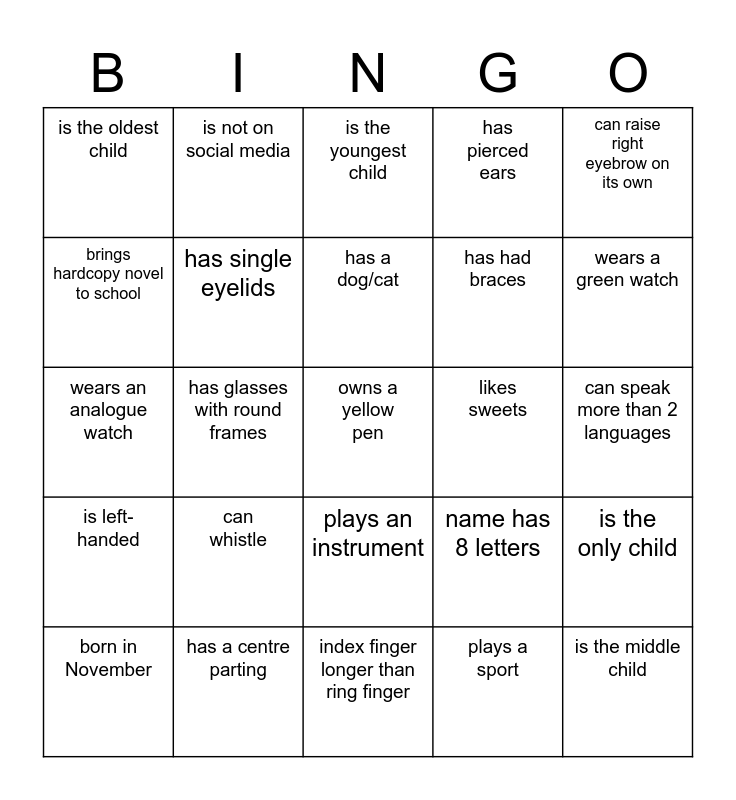This bingo card has a free space and 24 words: can whistle, has a centre parting, has a dog/cat, born in November, can raise right eyebrow on its own, is the oldest child, brings hardcopy novel to school, is not on social media, likes sweets, plays an instrument, has had braces, wears an analogue watch, name has 8 letters, is the only child, has single eyelids, plays a sport, can speak more than 2 languages, is the youngest child, wears a green watch, has glasses with round frames, is the middle child, is left-handed, has pierced ears and index finger longer than ring finger.