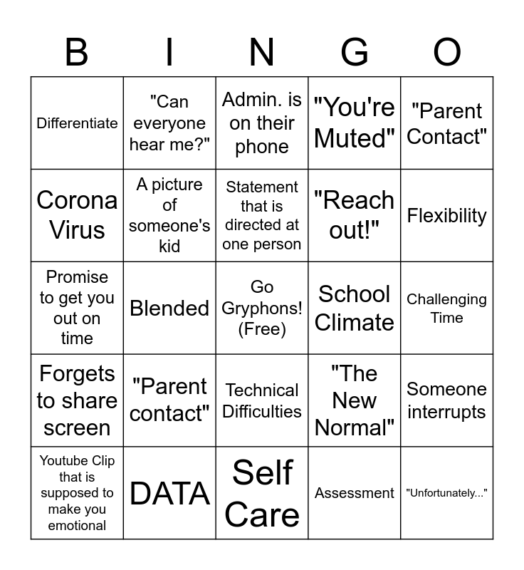 This bingo card has a free space and 29 words: Slideshow with very small font, DATA, Admin. is on their phone, Best Practices, "Parent Contact", Differentiate, A picture of someone's kid, Statement that is directed at one person, School Climate, Someone interrupts, Youtube Clip that is supposed to make you emotional, Blended, Assessment, "Unfortunately...", Promise to get you out on time, Consistency, Self Care, "The New Normal", Flexibility, Forgets to share screen, "Parent contact", "Let me just jump in for a sec", "Reach out!", Challenging Time, Corona Virus, "Can everyone hear me?", Technical Difficulties, "You're Muted" and Corny phrase or meme shared.