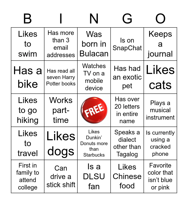This bingo card has a free space and 29 words: First in family to attend college, Favorite subject is math, Works part-time, Is a Ginebra Fan, Likes to swim, Was born in Bulacan, Has read all seven Harry Potter books, Likes dogs, Has over 20 letters in entire name, Can drive a stick shift, Plays a musical instrument, Favorite color that isn’t blue or pink, Is a DLSU fan, Likes Chinese food, Likes cats, Has a pet that weighs at least 10 pounds, Likes Dunkin’ Donuts more than Starbucks, Likes to travel, Keeps a journal, Likes to go hiking, Speaks a dialect other than Tagalog, Has more than 3 siblings, Has had an exotic pet, Has a bike, Is on SnapChat, Has more than 3 email addresses, Is currently using a cracked phone, Watches TV on a mobile device and Does not have a driver's license.
