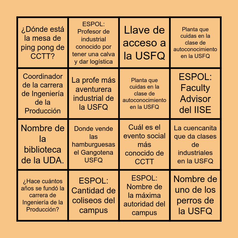 This bingo card has 28 words: ESPOL: Profesor de industrial conocido por tener una calva y dar logística, ¿Dónde comenzó la USFQ?, Nombre de la biblioteca de la UDA., Nombre de la biblioteca de la UDA., La profe más aventurera industrial de la USFQ, Llave de acceso a la USFQ, ESPOL: Profesor de industrial conocido por tener una calva y dar logística, Nombre de uno de los perros de la USFQ, ESPOL: Cantidad de coliseos del campus, Facultad de la cual se graduó la rectora actual de ESPOL, Cuál es el evento social más conocido de CCTT, Planta que cuidas en la clase de autoconocimiento en la USFQ, ESPOL: Cantidad de coliseos del campus, Nombre de uno de los perros de la USFQ, Donde vende las hamburguesas el Gangotena USFQ, ¿Cuántos pisos tiene el edificio de CCTT?, Número de niveles de inglés necesarios para graduarse en ESPOL, Planta que cuidas en la clase de autoconocimiento en la USFQ, ESPOL: Faculty Advisor del IISE, Última temática de disfraces por el aniversario de la USFQ, ¿Dónde está la mesa de ping pong de CCTT?, ESPOL: Animal símbolo antes que, ¿Hace cuántos años se fundó la carrera de Ingeniería de la Producción?, La cuencanita que da clases de industriales en la USFQ, ESPOL: Nombre de la máxima autoridad del campus, ESPOL: Significado de las siglas FIMCP, Coordinador de la carrera de Ingeniería de la Producción and La profe que es como la mama de todos los indsutriales USFQ.