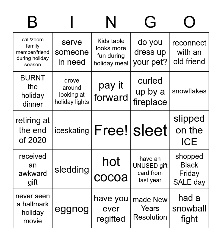 This bingo card has a free space and 24 words: sledding, eggnog, pay it forward, never seen a hallmark holiday movie, reconnect with an old friend, call/zoom family member/friend during holiday season, BURNT the holiday dinner, serve someone in need, sleet, hot cocoa, curled up by a fireplace, retiring at the end of 2020, have an UNUSED gift card from last year, shopped Black Friday SALE day, drove around looking at holiday lights, made New Years Resolution, slipped on the ICE, Kids table looks more fun during holiday meal, snowflakes, iceskating, had a snowball fight, received an awkward gift, do you dress up your pet? and have you ever regifted.