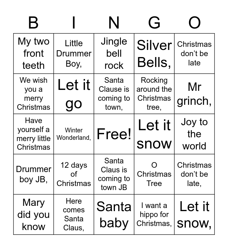 This bingo card has a free space and 131 words: Christmas Singo list, Little Drummer Boy,, It’s the most wonderful time of the year,, Have yourself a merry little Christmas,, Mistletoe JB,, Santa Claus is coming to town JB,, Drummer boy JB,, All I want for Christmas is you JB,, I’ll have a blue Christmas without you,, *NSYNC merry Christmas happy holidays,, Felices Navidad,, Rudolph,, I’ll be home for Christmas,, Grandmas got run over by a reindeer,, This Christmas,, All I want for Christmas is u,, I want a hippo for Christmas,, My two front teeth,, 12 days of Christmas,, Silent night,, Jingle bells,, Let it snow,, Rocking around the Christmas tree,, Santa baby,, I saw mommy kissing Santa Clause,, Last Christmas,, Winter Wonderland,, We wish you a merry Christmas,, Holly jolly Christmas,, It’s beginning to look a lot like Christmas,, Silver Bells,, Christmas don’t be late,, Mr grinch,, We wish you a merry Christmas,, Up on a housetop,, Frosty the snowman,, Jingle bell rock,, Little Saint Nick,, Must be Santa,, Carol of the bells,, Santa Clause is coming to town,, Joy to the world,, I really don’t hate Christmas,, Mary did you know,, White Christmas,, Let it go,, Blue Christmas,, Feliz Navidad,, Santa tell me,, Last Christmas,, Deck the halls,, Hallelujah,, Do u hear what I hear,, Happy Xmas,, We need a little Christmas,, O holy night (2014),, Away in a manger,, The chipmunk song,, The first Noel,, Here comes Santa Claus,, Jolly old Saint Nicholas,, O Christmas Tree,, O come all ye faithful,, The night before Christmas,, O little town of Bethlehem,, Underneath the tree, Little drummer boy, It’s the most wonderful time of the year, Have yourself a merry little Christmas, Mistletoe JB, Santa Claus is coming to town JB, Drummer boy JB, All I want for Christmas is you JB, I’ll have a blue Christmas without you, *NSYNC merry Christmas happy holidays, Felices navidad, Rudolph, I’ll be home for Christmas, Grandmas got run over by a reindeer, This Christmas, All I want for Christmas is u, I want a hippo for Christmas, My two front teeth, 12 days of Christmas, Silent night, Jingle bells, Let it snow, Rocking around the Christmas tree, Santa baby, I saw mommy kissing Santa Clause, Last Christmas, Winter wonderland, We wish you a merry Christmas, Holly jolly Christmas, It’s beginning to look a lot like Christmas, Silver bells, Christmas don’t be late, Mr grinch, We wish you a merry Christmas, Up on a housetop, Frosty the snowman, Jingle bell rock, Little Saint Nick, Must be Santa, Carol of the bells, Santa Clause is coming to town, Joy to the world, I really don’t hate Christmas, Mary did you know, White Christmas, Let it go, Blue Christmas, Feliz navidad, Santa tell me, Last Christmas, Deck the halls, Hallelujah, Do u hear what I hear, Happy Xmas, We need a little Christmas, O holy night (2014), Away in a manger, The chipmunk song, The first Noel, Here comes Santa Claus, Jolly old Saint Nicholas, O Christmas Tree, O come all ye faithful, The night before Christmas, O little town of Bethlehem and Underneath the tree.