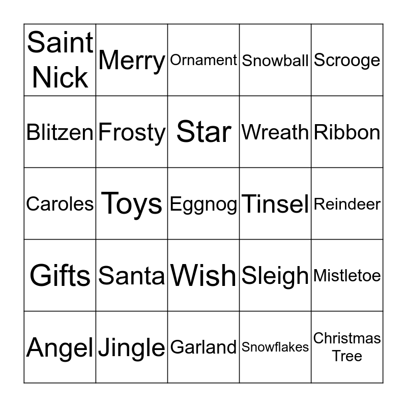 This bingo card has a free space and 45 words: Comet, Christmas Tree, Cupid, Angel, Rudolph, Snowflakes, Ornament, Dancer, Scrooge, Jingle, Snowball, Tinsel, Wish, Santa, Dasher, Garland, Yuletide, Caroles, Vixen, Ribbon, Merry, Prancer, Donner, Saint Nick, Poinsettia, Reindeer, North Pole, Lights, Sleigh, Gifts, Elves, Mistletoe, Candy Can, Joy, Sled, Toys, Scrooge, Decoration, Holly, Star, Blitzen, Wreath, Chimney, Frosty and Presents.