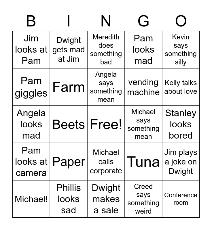 This bingo card has a free space and 29 words: Michael!, Jim looks at camera, Beets, Andy sings, Jim looks at Pam, Meredith does something bad, Farm, Paper, Michael says something mean, Phillis looks sad, Stanley looks bored, Conference room, Dwight makes a sale, Creed says something weird, Kelly talks about love, Michael talks about Ryan, Michael calls corporate, Pam looks at camera, Kevin says something silly, Angela looks mad, Tuna, Oscar says something smart, vending machine, Pam giggles, Pam looks mad, Dwight gets mad at Jim, Jim plays a joke on Dwight, Angela says something mean and Party planning committee.