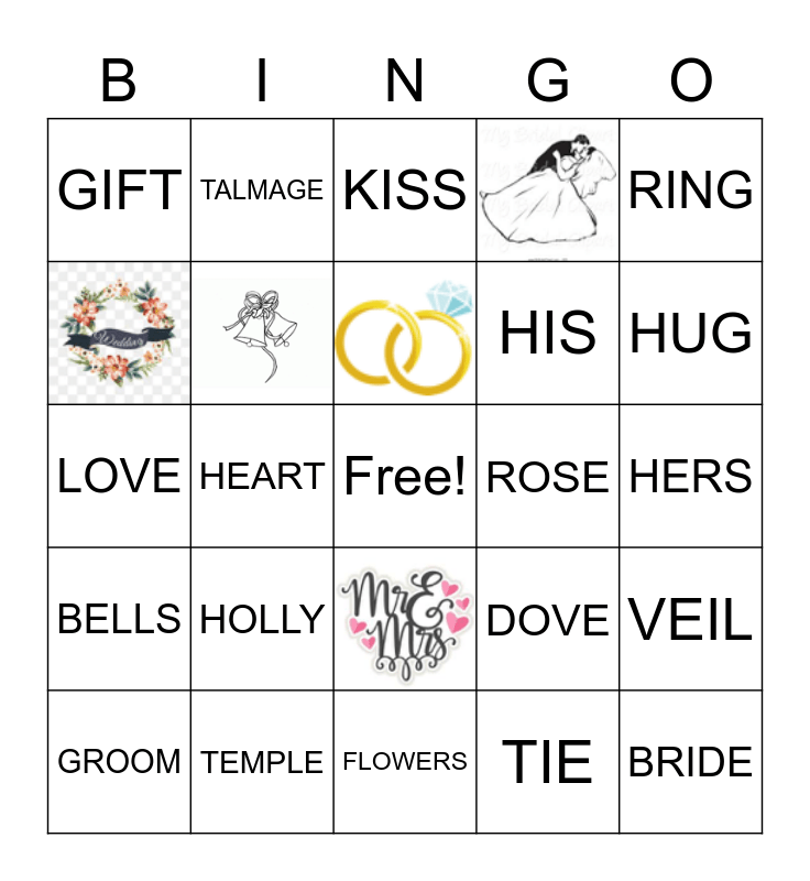 This bingo card has 10 images, a free space and 25 words: LOVE, RING, HOPE, CAKE, GIFT, ROSE, TIE, HEART, BELLS, BRIDE, DOVE, GROOM, VEIL, TEMPLE, KISS, HUG, FOREVER, PROMISE, HIS, HERS, BOUQUET, FLOWERS, HOLLY, TALMAGE and KANSAS CITY.