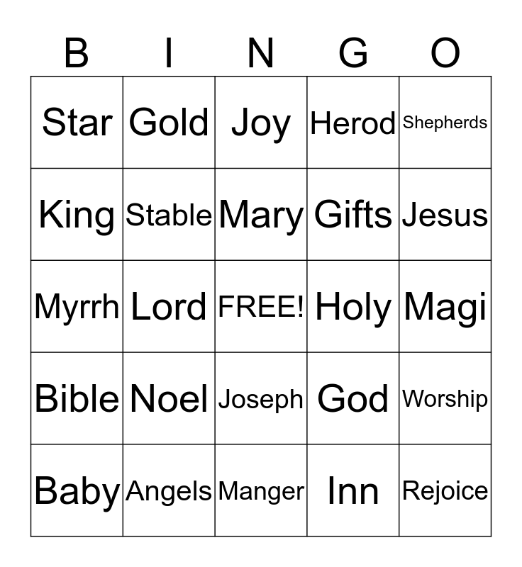 This bingo card has a free space and 24 words: Noel, Angels, Mary, Baby, Shepherds, Star, King, Gold, Holy, Joseph, Gifts, Myrrh, God, Worship, Stable, Inn, Magi, Joy, Jesus, Lord, Rejoice, Bible, Herod and Manger.