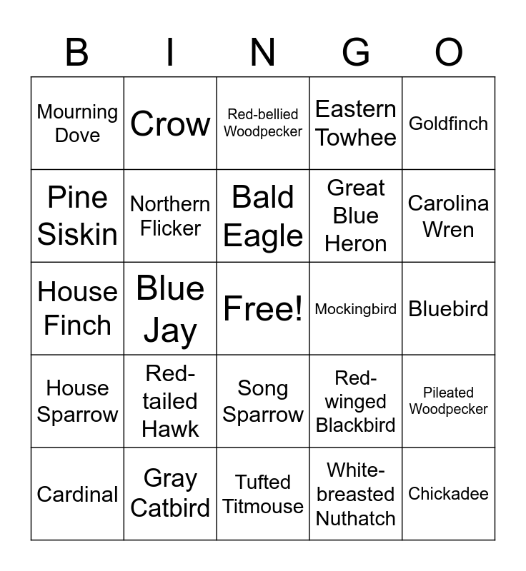 This bingo card has a free space and 29 words: Cardinal, Downy Woodpecker, Blue Jay, Dark-eyed Junco, Mourning Dove, Red-bellied Woodpecker, Northern Flicker, Red-tailed Hawk, Mockingbird, Gray Catbird, Bluebird, Chickadee, Tufted Titmouse, White-breasted Nuthatch, Carolina Wren, Golden-crowned Kinglet, Song Sparrow, House Sparrow, Goldfinch, House Finch, Red-winged Blackbird, Starling, Great Blue Heron, Pine Siskin, Eastern Towhee, Crow, Pileated Woodpecker, Bald Eagle and Barred Owl.