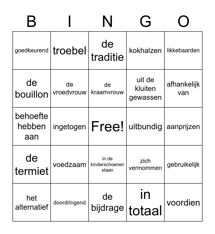 This bingo card has a free space and 36 words: de bevalling, de carnavalskraker, de sprinkhaan, de vroedvrouw, zich vermommen, de termiet, de kraamvrouw, het volksfeest, likkebaarden, de navelstreng, ingetogen, kokhalzen, afkeurend, uitbundig, afhankelijk van, goedkeurend, beduusd, voedzaam, voordien, de traditie, aanprijzen, gebruikelijk, doordringend, het alternatief, de bijdrage, troebel, behoefte hebben aan, de methode, uit de kluiten gewassen, de bouillon, ingrijpen, uit je bol gaan, in totaal, in de kinderschoenen staan, zo zout heb ik het nog nooit gegeten and het water loopt me in de mond.