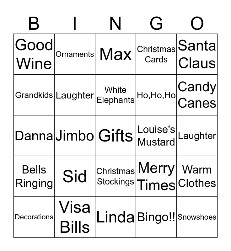 This bingo card has a free space and 24 words: Sid, Visa Bills, White Elephants, Decorations, Santa Claus, Good Wine, Grandkids, Ornaments, Louise's Mustard, Christmas Stockings, Ho,Ho,Ho, Danna, Merry Times, Warm Clothes, Laughter, Bingo!!, Laughter, Max, Candy Canes, Jimbo, Snowshoes, Bells Ringing, Christmas Cards and Linda.