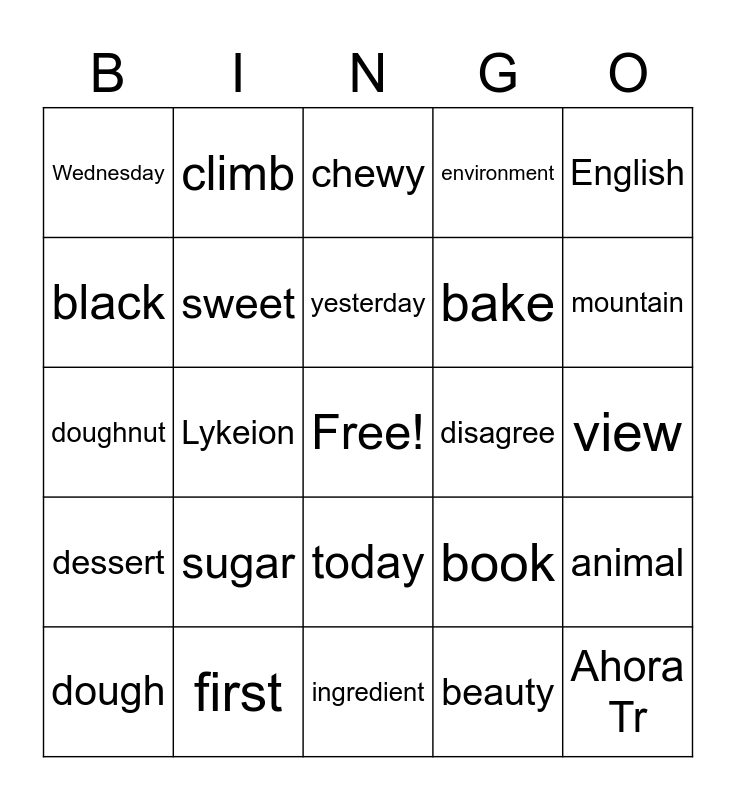 This bingo card has a free space and 28 words: animal, attract, bake, beauty, black, chewy, climb, dessert, disagree, dough, doughnut, environment, first, ingredient, mountain, noisy, sugar, sweet, yesterday, today, Wednesday, Alex Tr, Ahora Tr, Lykeion, view, book, English and search.