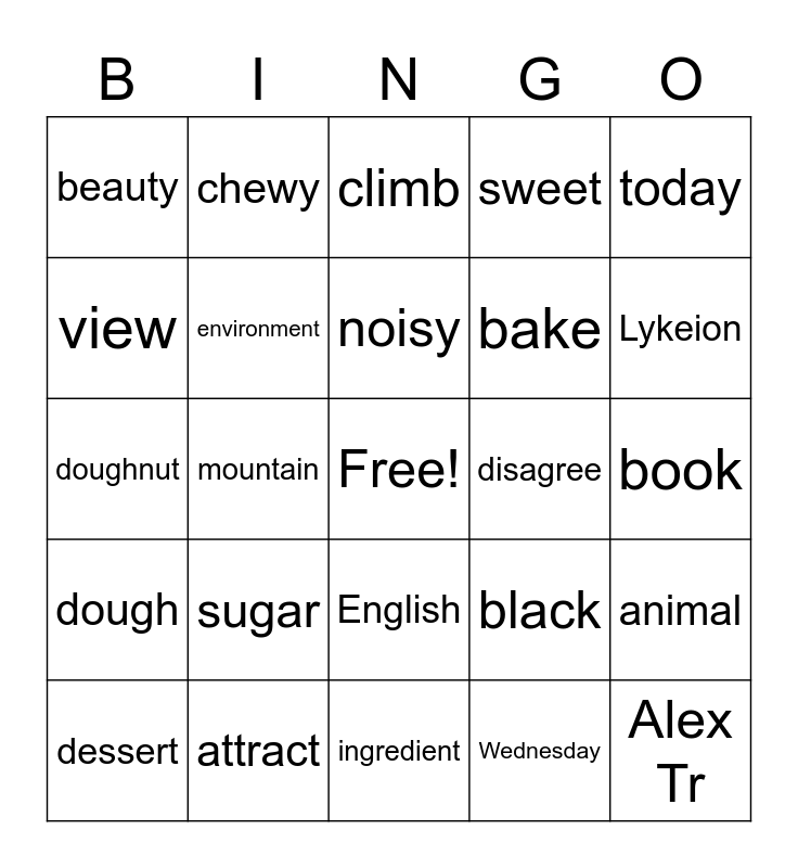 This bingo card has a free space and 28 words: animal, first, bake, Wednesday, view, climb, chewy, dough, disagree, dessert, doughnut, sweet, attract, ingredient, Lykeion, yesterday, sugar, environment, noisy, English, beauty, Ahora Tr, Alex Tr, mountain, book, black, today and search.