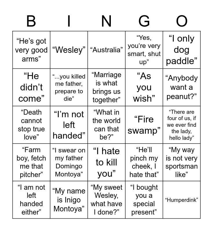 This bingo card has a free space and 51 words: “Farm boy, polish my horse’s saddle”, “I swear on my father Domingo Montoya”, “Then there will be no one to hear you scream”, “I bought you a special present”, “Anybody want a peanut?”, “The Princess Bride”, “Wesley”, “Buttercup”, “As you wish”, “Humperdink”, “Death cannot stop true love”, “...you killed me father, prepare to die”, “He’ll pinch my cheek, I hate that”, “There are four of us, if we ever find the lady, hello lady”, “Princess Buttercup”, “Inconceivable”, “Australia”, “Fire swamp”, “Boo”, “He didn’t come”, “I’m not left handed”, “Unemployed in Greenland”, “Yes, you’re very smart, shut up”, “I only dog paddle”, “Liar, LIAR”, “Have fun storming the castle”, “Marriage is what brings us together”, “Man and wife”, “My way is not very sportsman like”, “He’s got very good arms”, “I only dog paddle”, “I don’t mind so much”, “Murdered by pirates is good”, “Doesn’t sounds too bad, I’ll try and stay awake”, “A book”, “Life isn’t always fair”, “Keep your shirt on, let me read”, “And this is a special book”, “Did I make it clear to you, your job is at stake”, “The cliffs of insanity”, “My name is Inigo Montoya”, “I hate to kill you”, “Gently”, “Where’s the poison?”, “I am not left handed either”, “I hate to die”, “My sweet Wesley, what have I done?”, “Poor and perfect”, “I’ll never love again”, “Farm boy, fetch me that pitcher” and “Farm boy, fill these with water”.