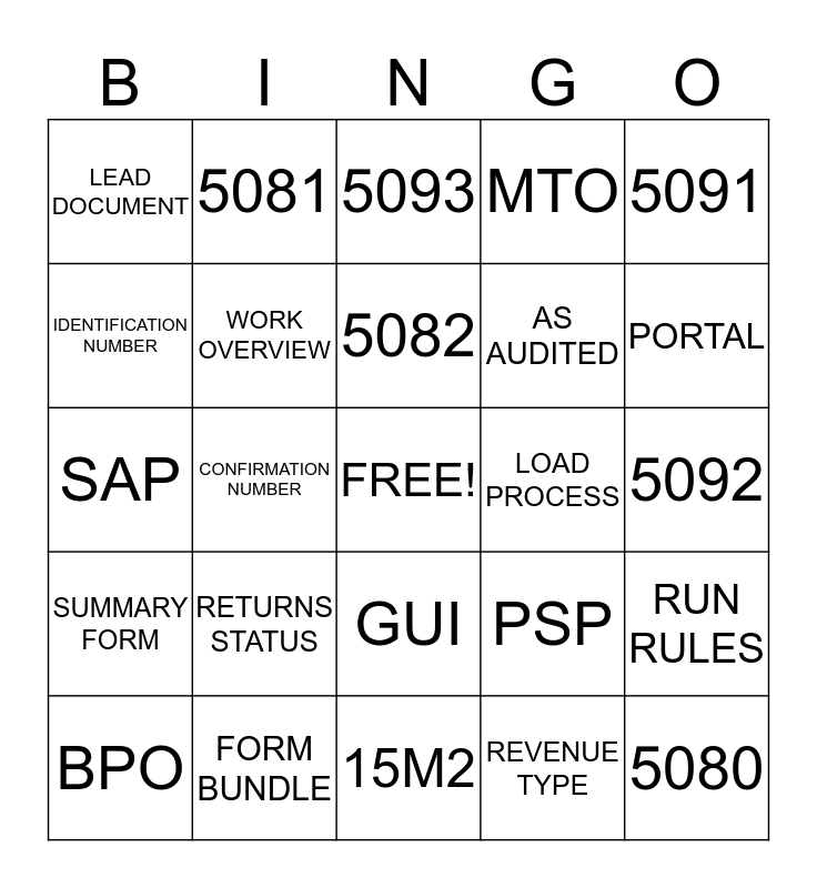 This bingo card has a free space and 24 words: RETURNS STATUS, FORM BUNDLE, 5082, BPO, 5091, LEAD DOCUMENT, IDENTIFICATION NUMBER, 5081, LOAD PROCESS, GUI, AS AUDITED, SAP, PSP, RUN RULES, WORK OVERVIEW, REVENUE TYPE, 5092, 5093, PORTAL, CONFIRMATION NUMBER, 5080, SUMMARY FORM, MTO and 15M2.