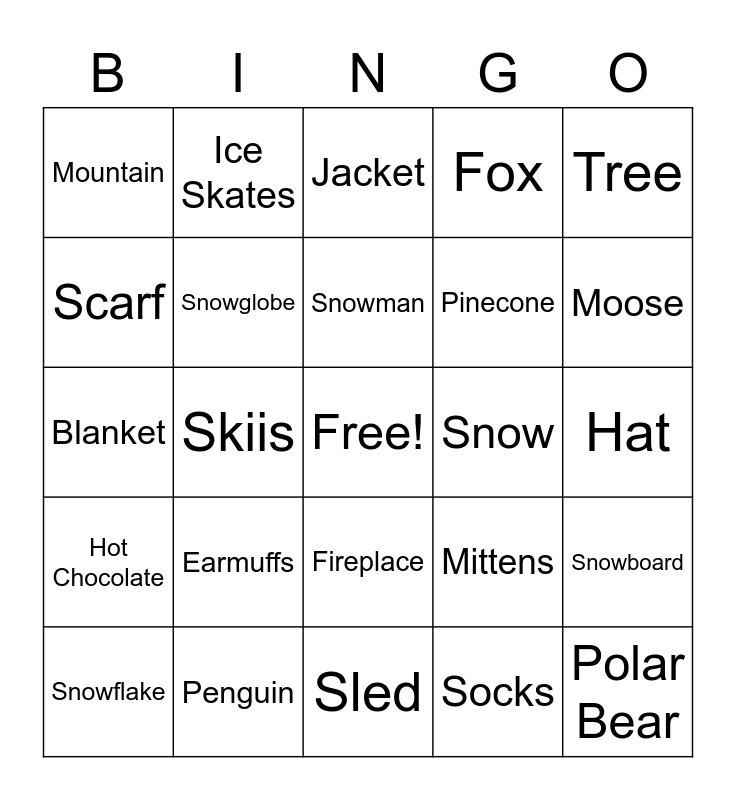 This bingo card has a free space and 24 words: Snowflake, Earmuffs, Snowman, Socks, Tree, Mountain, Ice Skates, Jacket, Snow, Hat, Blanket, Snowglobe, Mittens, Snowboard, Scarf, Penguin, Sled, Fox, Moose, Hot Chocolate, Skiis, Fireplace, Pinecone and Polar Bear.