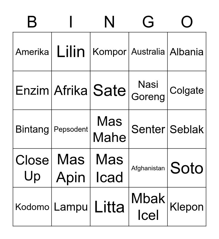 This bingo card has a free space and 24 words: Mas Apin, Lampu, Sate, Kodomo, Albania, Amerika, Enzim, Lilin, Senter, Mas Icad, Nasi Goreng, Bintang, Afghanistan, Soto, Afrika, Mbak Icel, Seblak, Kompor, Colgate, Pepsodent, Klepon, Close Up, Australia and Litta.