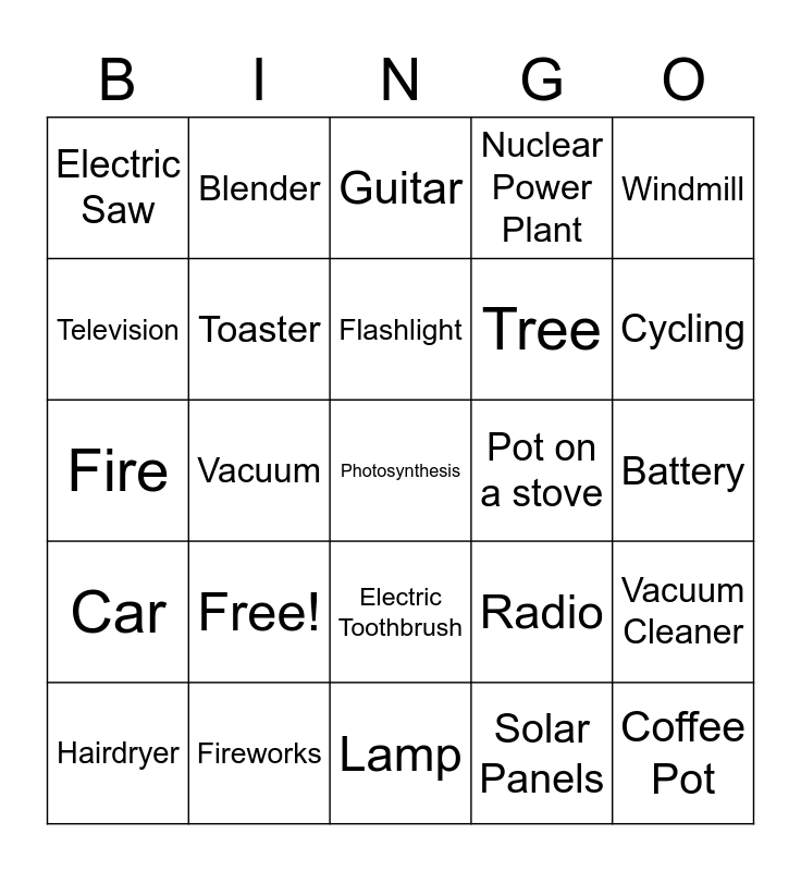 This bingo card has 25 words: Free!, Lamp, Flashlight, Hairdryer, Windmill, Electric Saw, Television, Blender, Pot on a stove, Electric Toothbrush, Tree, Fire, Radio, Vacuum Cleaner, Toaster, Coffee Pot, Battery, Guitar, Cycling, Vacuum, Photosynthesis, Fireworks, Car, Nuclear Power Plant and Solar Panels.