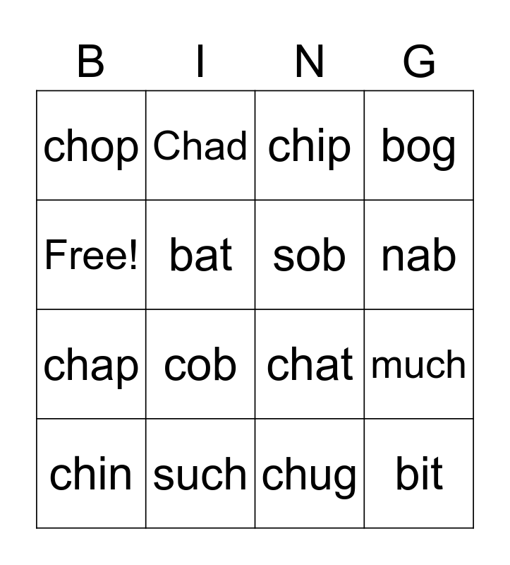 This bingo card has 16 words: such, much, chip, chop, chap, Chad, chat, chug, Free!, bat, chin, bog, cob, nab, sob and bit.