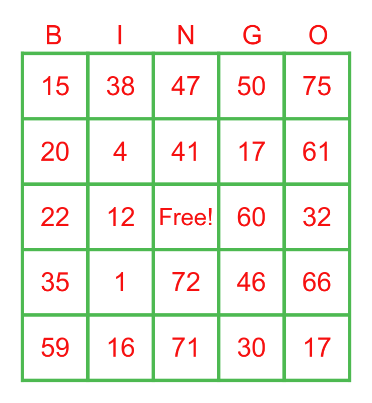 This bingo card has a free space and 24 words: 1, 16, 41, 59, 75, 15, 20, 38, 60, 72, 17, 22, 46, 66, 4, 30, 32, 47, 61, 12, 17, 35, 50 and 71.