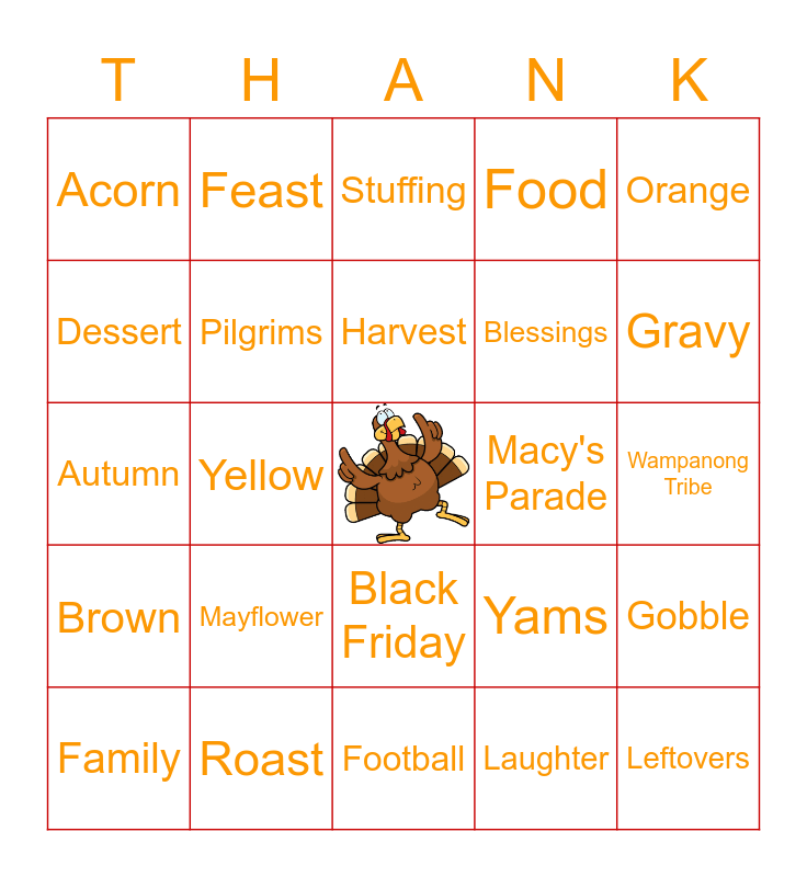 This bingo card has a free space and 39 words: Corn, Potatoes, Turkey, Pilgrims, Family, Black Friday, Harvest, Apple Pie, Orange, Brown, Yellow, Food, Leftovers, Wampanong Tribe, Macy's Parade, Mayflower, Bread Rolls, Acorn, November, Yams, Dessert, Football, Blessings, Gravy, Decorations, Pumpkin, Cranberry, Thursday, Native Americans, Feast, Thankful, Indians, Stuffing, Roast, Laughter, Games, Gobble, Autumn and Fall.