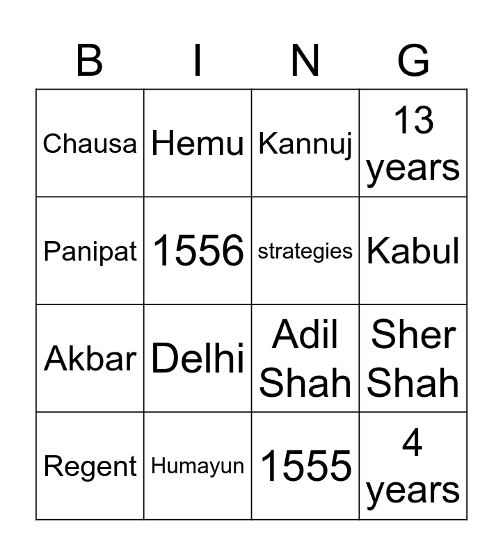This bingo card has 16 words: Humayun, Sher Shah, Kannuj, Chausa, Akbar, Hemu, Adil Shah, 1555, Panipat, 1556, Regent, 13 years, Delhi, Kabul, strategies and 4 years.