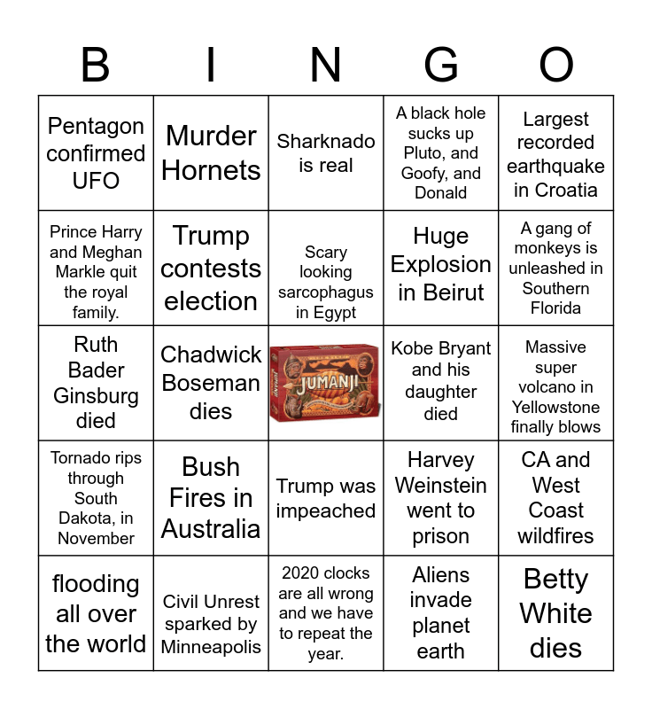 This bingo card has a free space and 24 words: Bush Fires in Australia, Civil Unrest sparked by Minneapolis, Scary looking sarcophagus in Egypt, flooding all over the world, Largest recorded earthquake in Croatia, Pentagon confirmed UFO, Prince Harry and Meghan Markle quit the royal family., Murder Hornets, Kobe Bryant and his daughter died, Trump was impeached, Huge Explosion in Beirut, Ruth Bader Ginsburg died, Harvey Weinstein went to prison, CA and West Coast wildfires, Trump contests election, Aliens invade planet earth, Massive super volcano in Yellowstone finally blows, Sharknado is real, A gang of monkeys is unleashed in Southern Florida, Chadwick Boseman dies, Betty White dies, Tornado rips through South Dakota, in November, A black hole sucks up Pluto, and Goofy, and Donald and 2020 clocks are all wrong and we have to repeat the year..