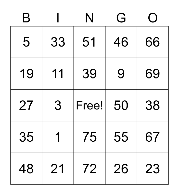 This bingo card has a free space and 24 words: 1, 21, 39, 48, 66, 5, 19, 33, 50, 75, 9, 27, 55, 67, 11, 26, 38, 51, 69, 3, 23, 35, 46 and 72.
